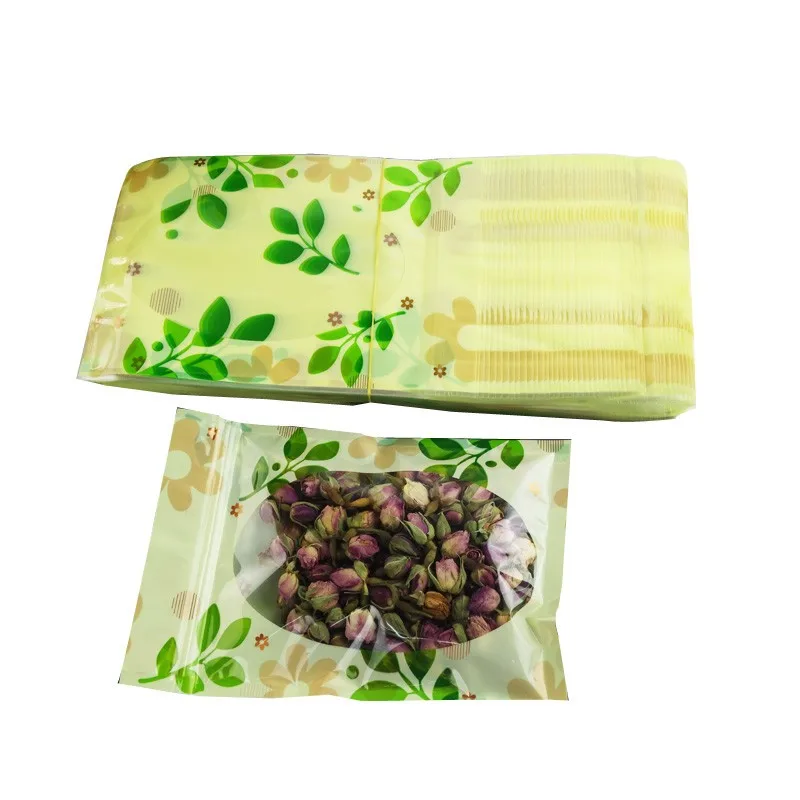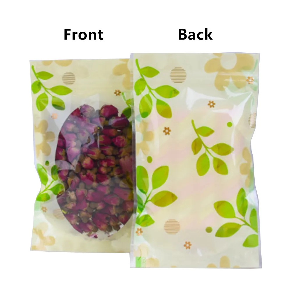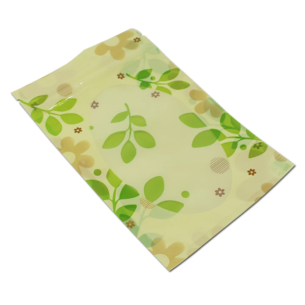100Pcs/Lot Tear Notch Reusable Food Chocolate Cookies Tea Storage Pack Zip Lock Plastic Bag with Clear Window Green Leaf Printed